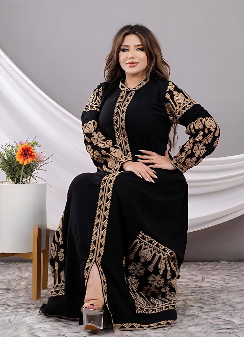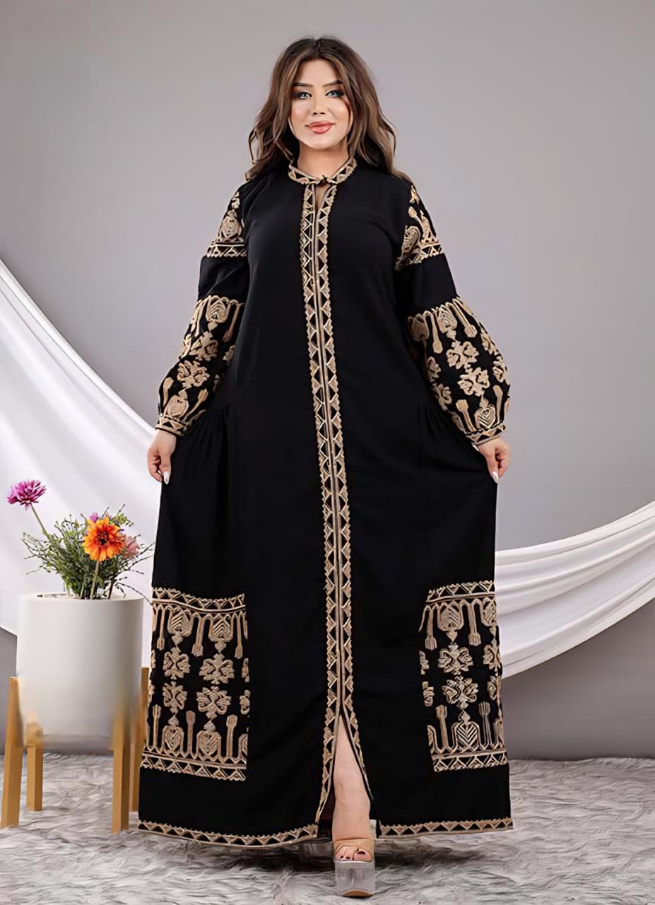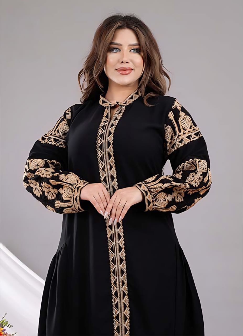 Royal Golden-Embroidered Saudi Crepe Abaya Step into the spotlight with this masterpiece that blends the richness of deep black Saudi Crepe with intricate, heavy Jordanian gold embroidery. Designed for the woman who seeks a majestic presence, this abaya features exquisite patterns adorning the sleeves, the frontal opening, and the hemline.