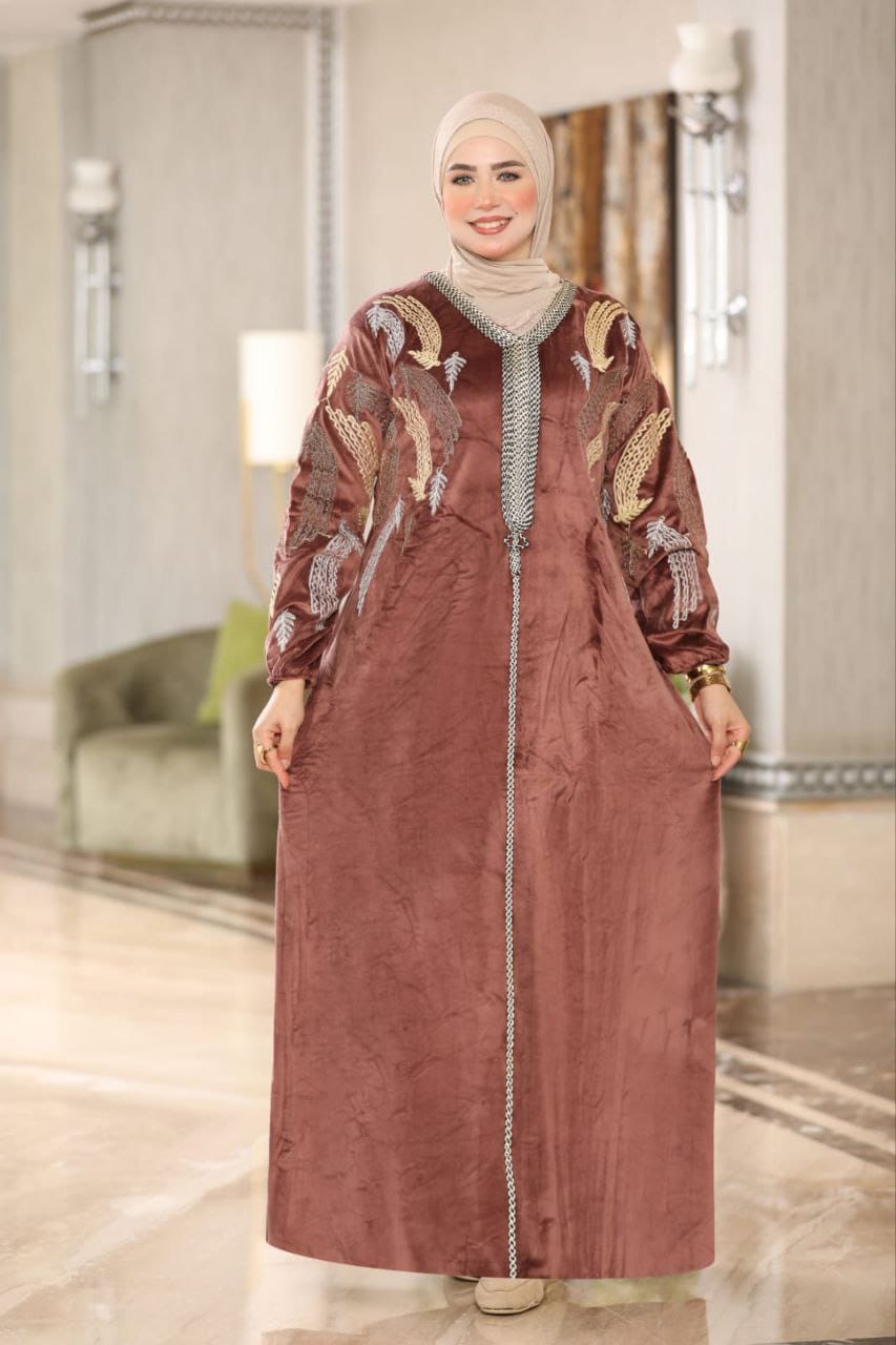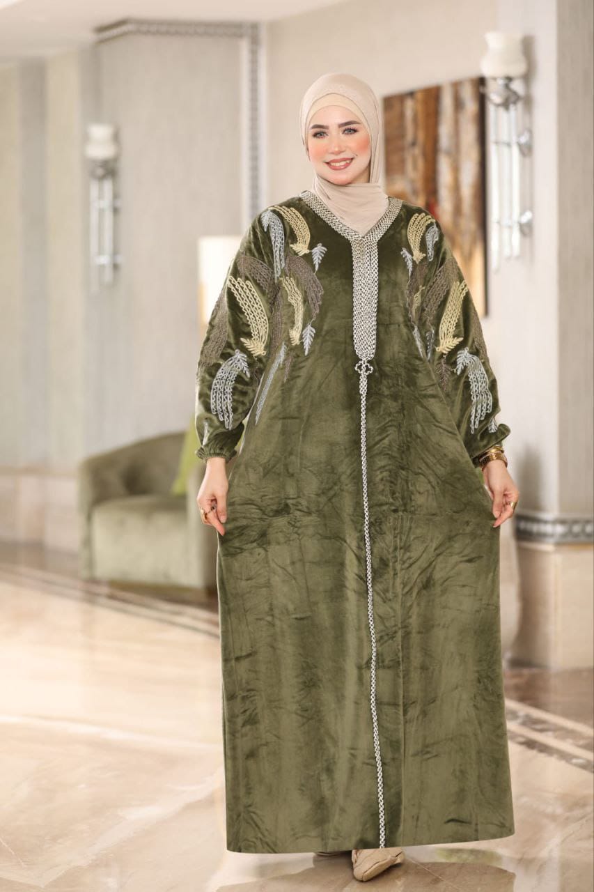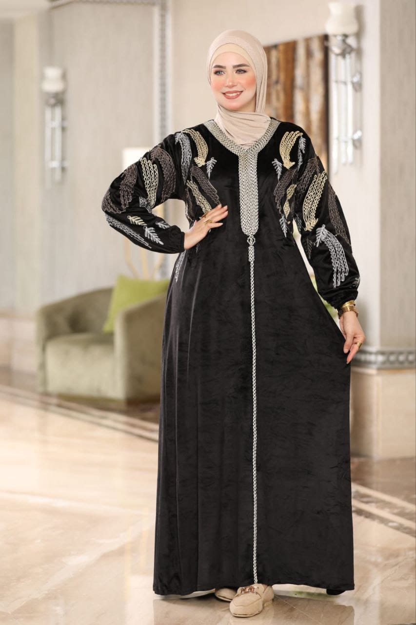 Elegant abaya made of premium Heidi velvet, featuring wool thread embroidery on the sleeves and front for a luxurious, sophisticated touch.