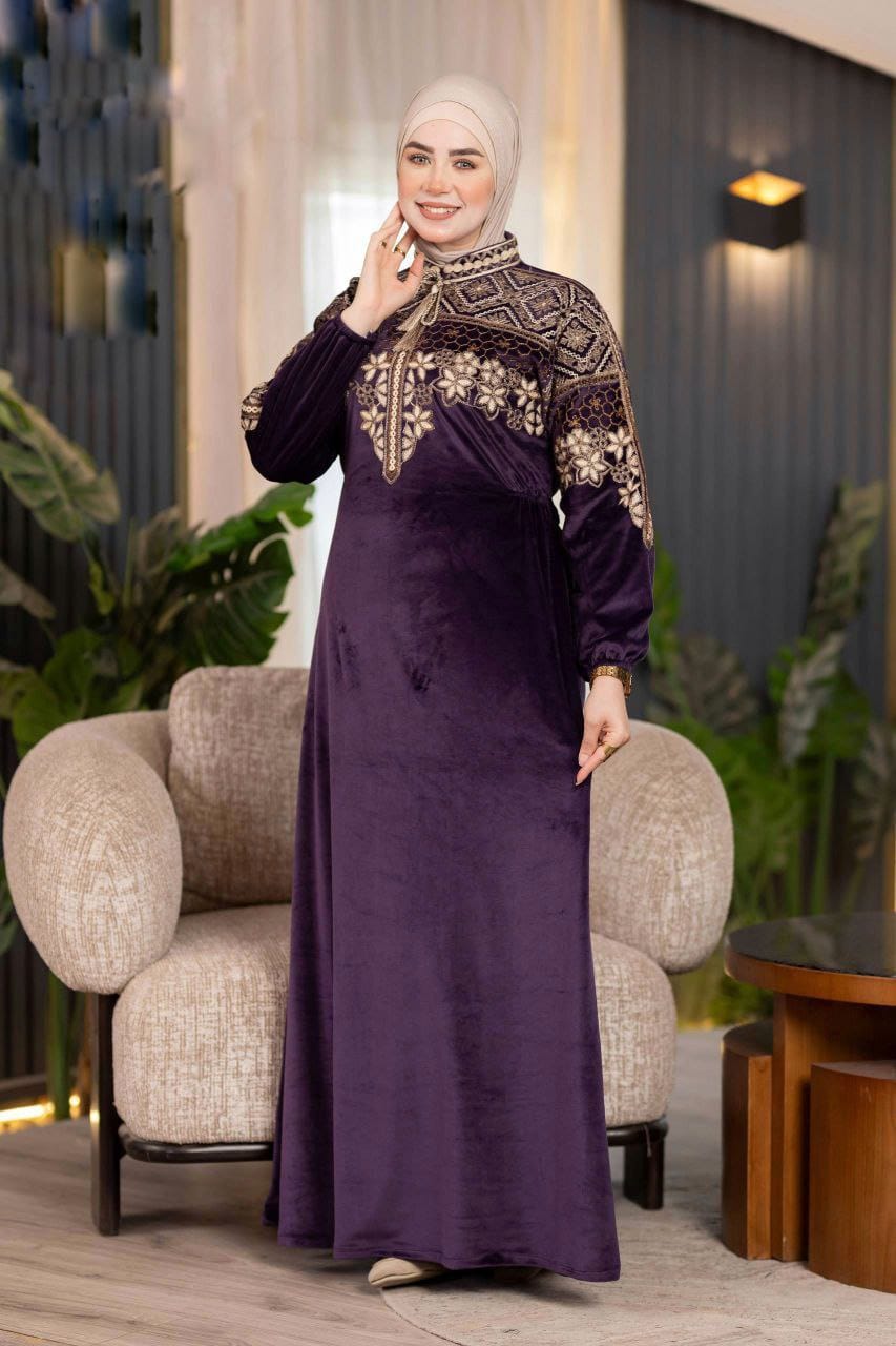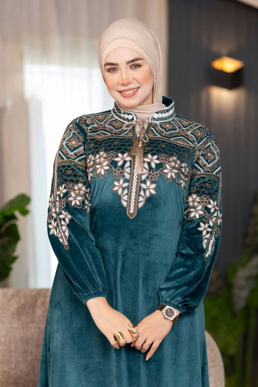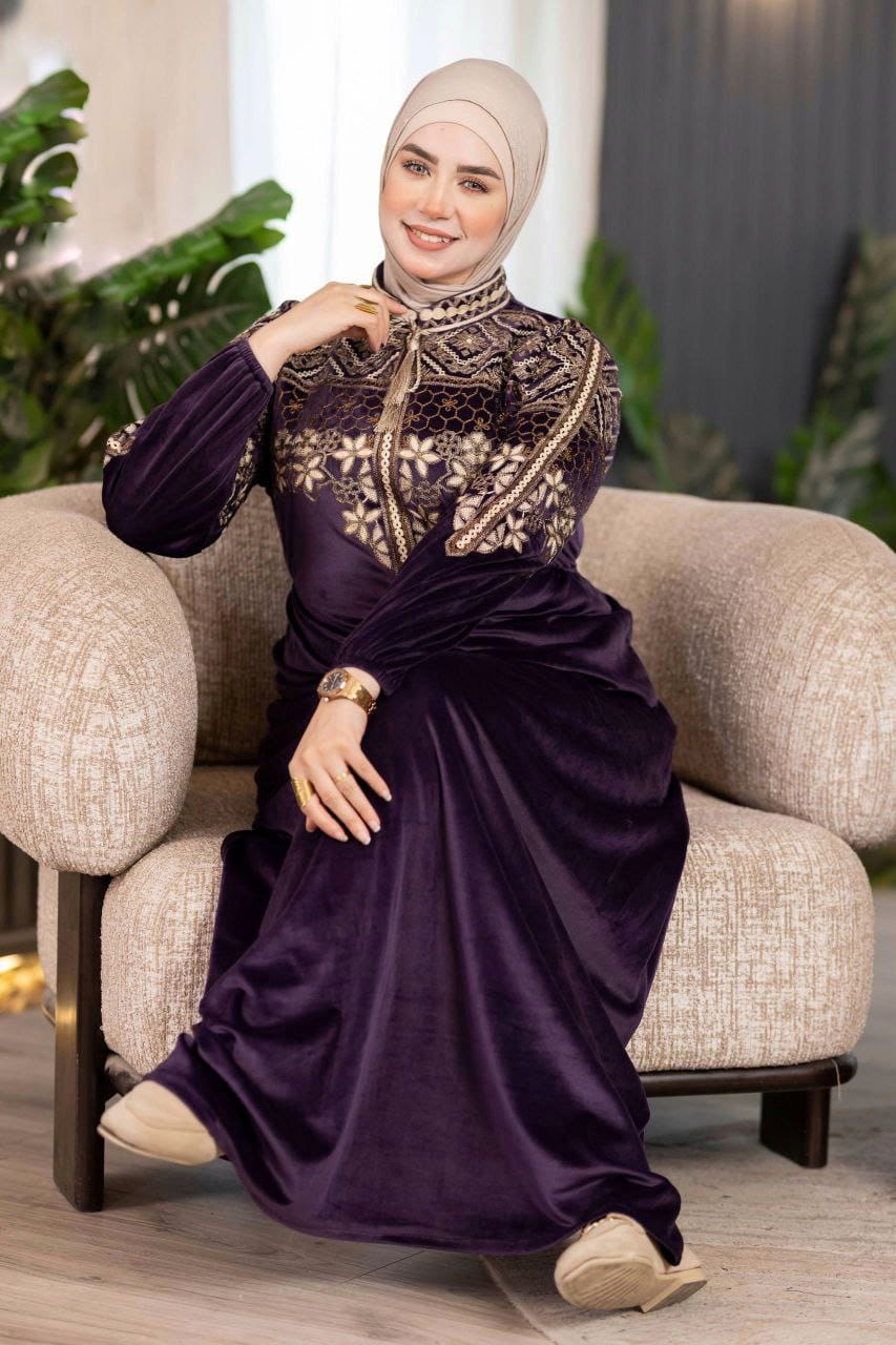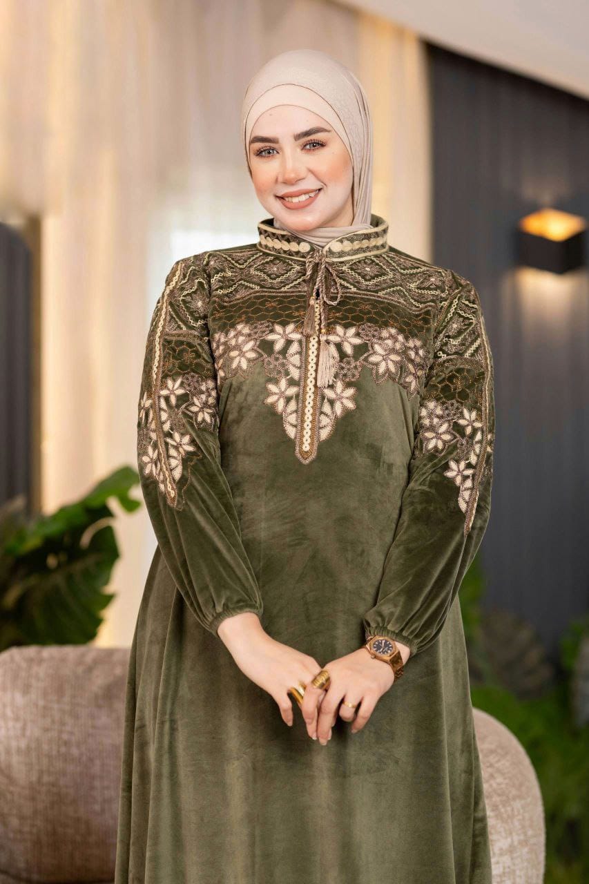 Luxurious abaya made of premium Heidi velvet, featuring shimmering thread embroidery on the chest and sleeves for a refined feminine look.