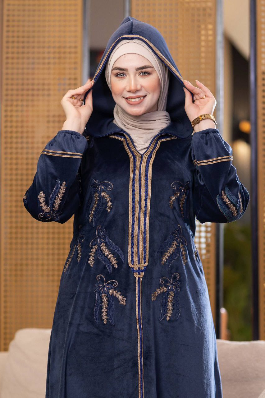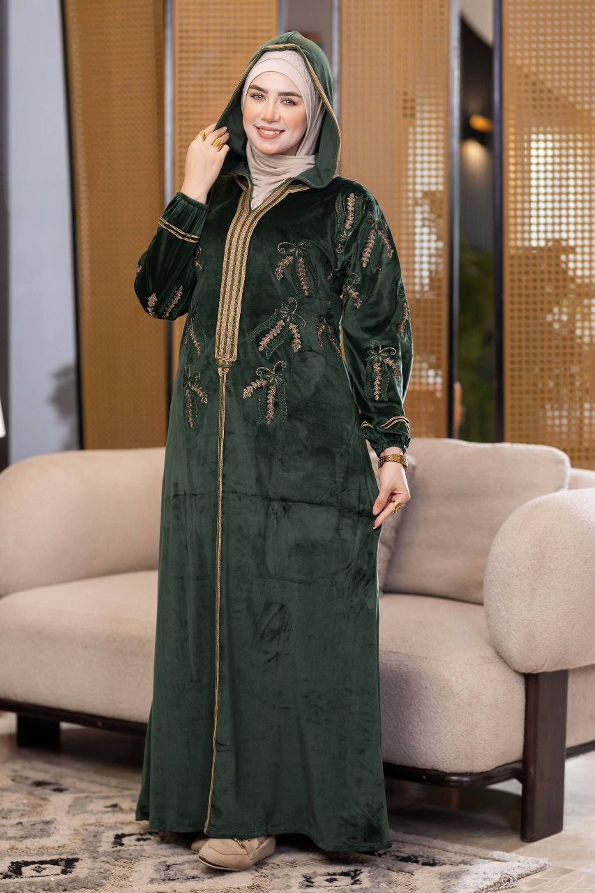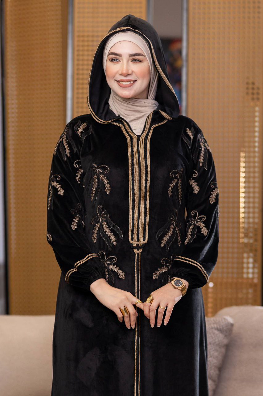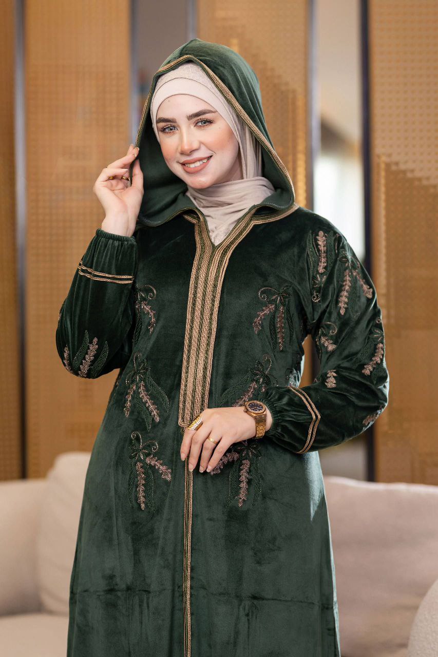 Elegant winter abaya made of premium Haidi velvet fabric, soft and cozy to the touch. Adorned with refined cotton embroidery for a luxurious touch, and designed with a stylish hood that adds a modern flair. Comfortable and perfect for daily outings or winter occasions.