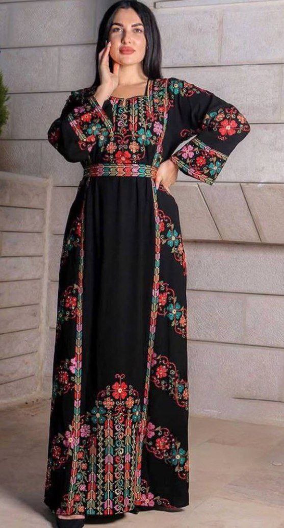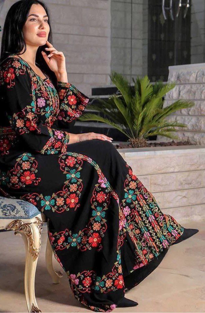 • Embroidery: An artistic masterpiece of colorful Jordanian embroidery (classic Fallahi style), featuring a harmonious blend of pink, turquoise, and gold. The intricate patterns adorn the chest and sleeves, extending beautifully along the sides and the back of the garment.